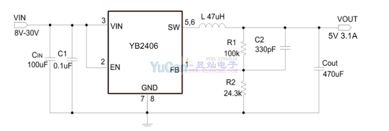 YB2406內(nèi)置線電壓補(bǔ)償,可通過調(diào)節(jié)FB端口的分壓電阻阻值來實(shí)現(xiàn).YB2406不僅可實(shí)現(xiàn)單芯片降壓電源管理方案,還可以與QC20/QC30識(shí)別芯片構(gòu)成快速充電電源管理方案。另外,芯片包含多重保護(hù)功能:過溫保護(hù),輸出短路保護(hù)和輸入欠壓過壓保護(hù)等。