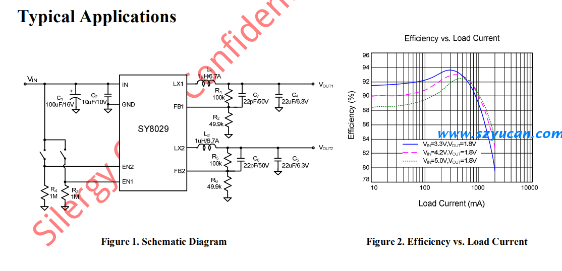 The SY8029 is a dual-output, high efficiency 2MHz synchronous step down DC-DC regulator IC, capable of delivering up to 2A output current each output channel. The SY8029 operates over a wide input voltage range from 2.5V to 5.5V and integrates mainswitch and synchronous switch with very low RDS(ON)to minimize the conduction loss.